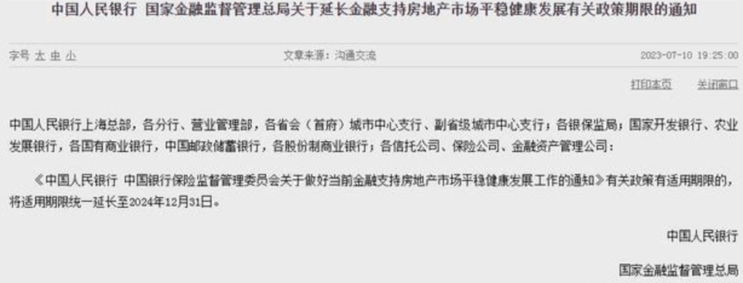 7月10日晚间,中国人民银行、国家金融监督管理总局发布《关于延长金融支持房地产市场平稳健康发展有关政策期限的通知》,对2022年11月发布的《关于做好当前金融支持房地产市场平稳健康发展工作的通知》中有关政策有适用期限的,将适用期限统一延长至2024年12月31日。