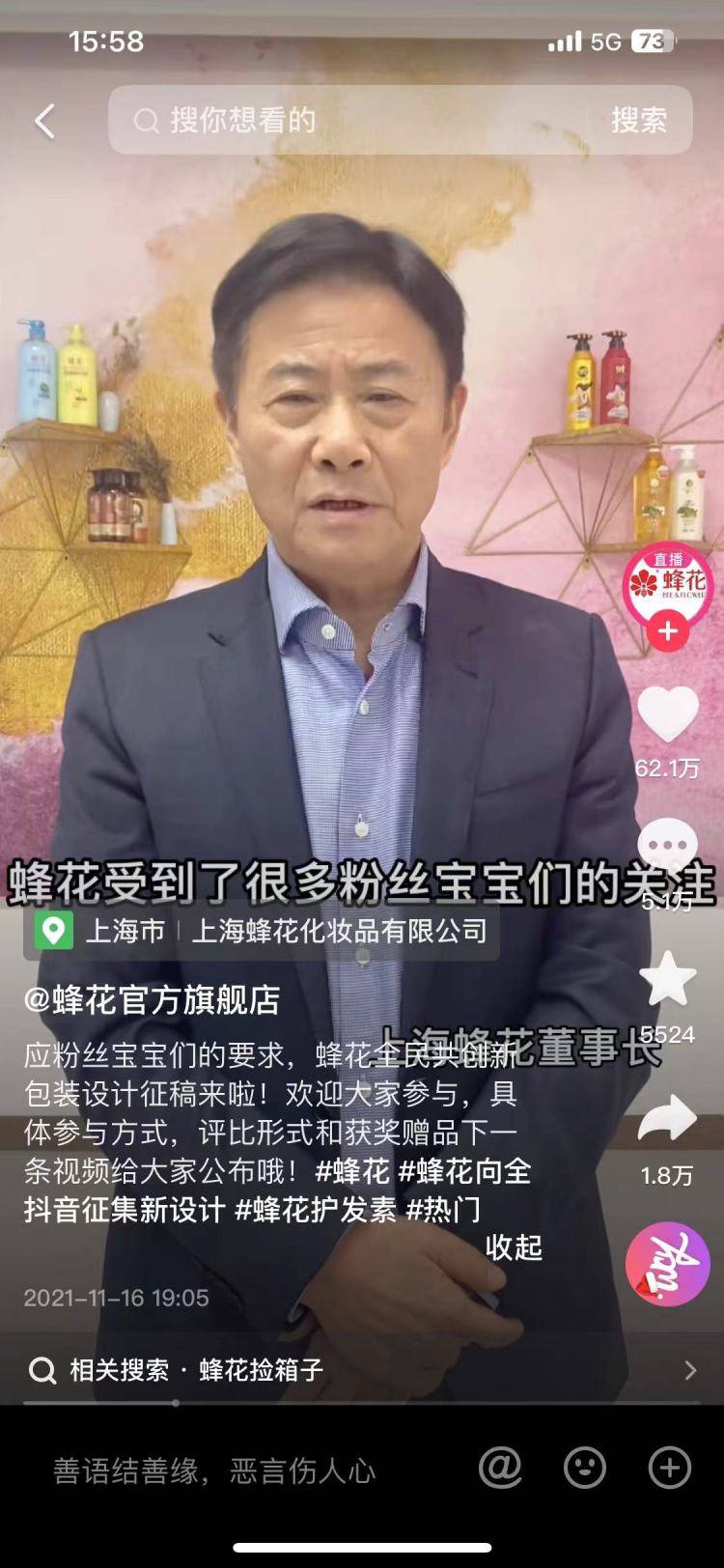 蜂花董事长顾锦文在抖音短视频出镜