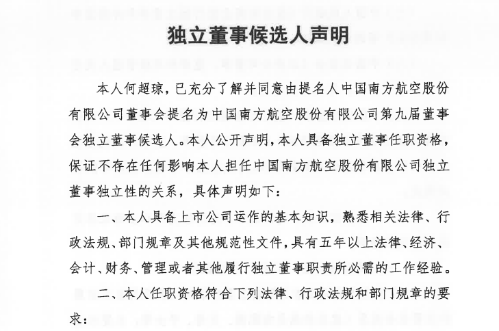 对于南方航空的此项提名,何超琼本人也颇为重视。在公告中,她声明道:本人具备独立董事任职资格,保证不存在任何影响本人担任南方航空独立董事独立性的关系。