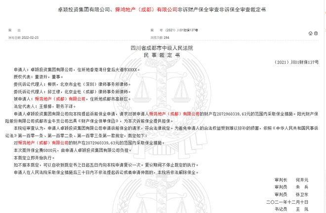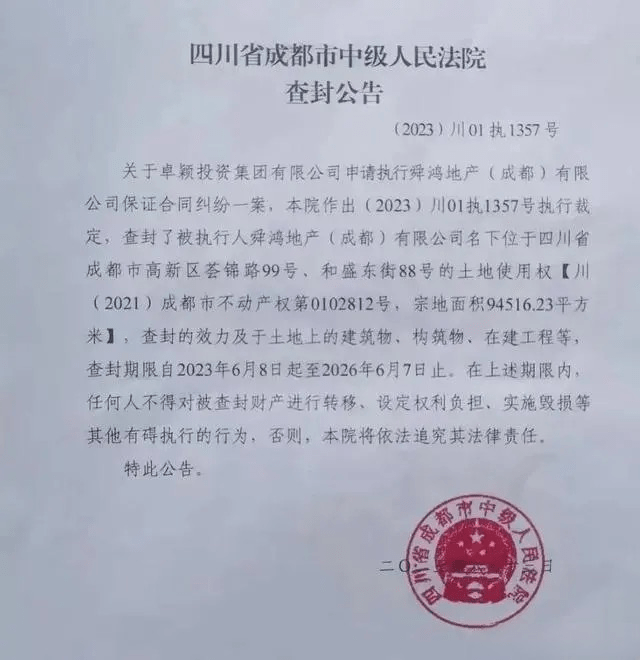 高入低出的后果也显而易见,在抢购一空后,南城都汇便再无消息。直到去年2月23日,中国裁判文书网公布了两份查封房产的裁定书,其中舜鸿地产(成都)有限公司的涉及项目就是位于成都市高新区的南城都汇,由卓颖投资集团有限公司申请查封,查封期限设定为三年。