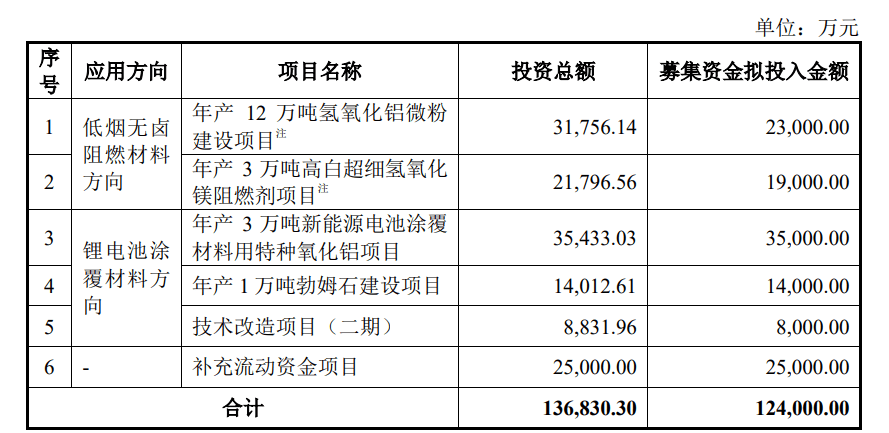 中超股份本次拟募集不超过18,700,000股,募集资金为12.4亿元,本次募集资金扣除发行费用后,拟投资以下项目:年产12万吨氢氧化铝微粉建设项目、年产3万吨高白超细氢氧化镁阻燃剂项目、年产3万吨高白超细氢氧化镁阻燃剂项目、年产1万吨勃姆石建设项目、技术改造项目(二期)、补充流动资金项目。