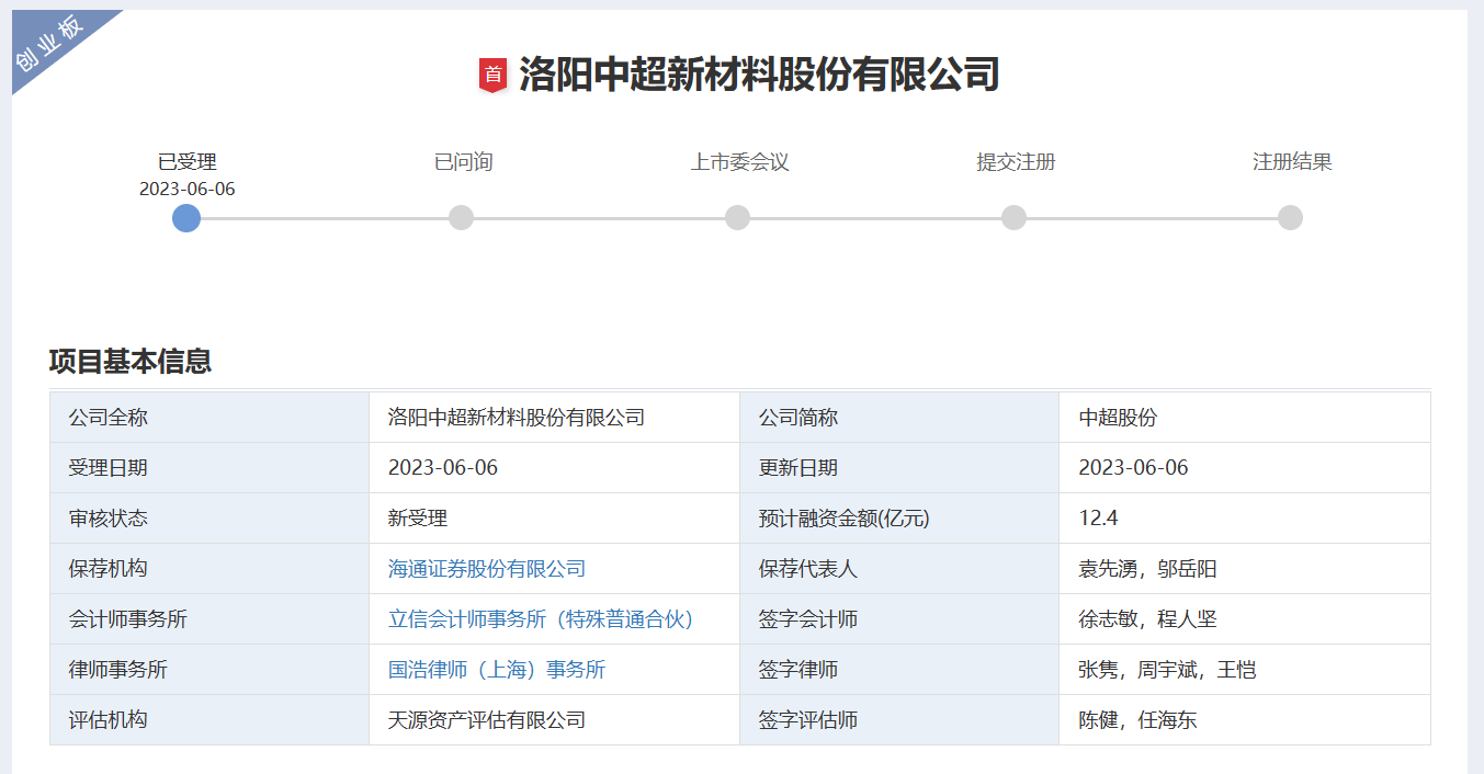 深交所官网消息显示,2023年6月6日,洛阳中超新材料股份有限公司(简称“中超股份”)IPO获受理,此次发行上市保荐机构是海通证券股份有限公司。