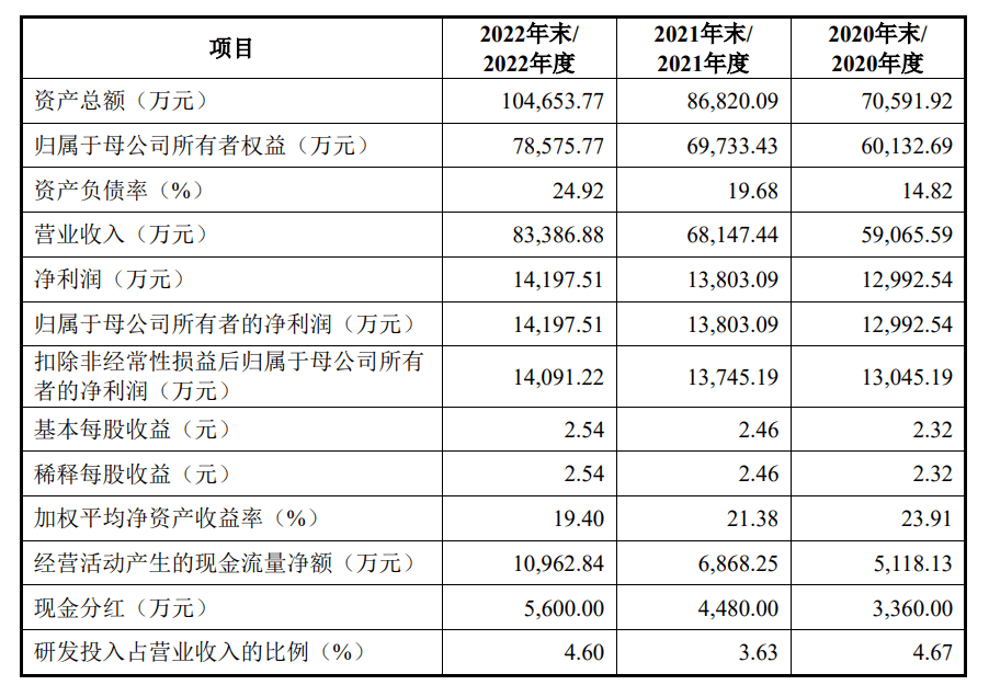 2020年度至2022年度,公司营业收入分别为59,065.59万元、68,147.44万元和83,386.88万元,归属于母公司所有者的净利润分别为12,992.54万元、13,803.09万元和14,197.51万元。