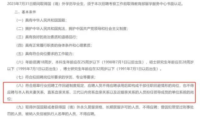 该回避要求并非今年首次出现,以山东烟草局为例,该局2022年高校毕业生招聘公告就要求应聘者符合烟草行业招聘工作回避制度规定,应聘人员不得应聘录用后即构成干部任职回避情形的岗位,也不得应聘与本人有夫妻关系、直系血亲关系、三代以内旁系血亲关系以及近姻亲关系的人员担任领导成员的单位系统的岗位。