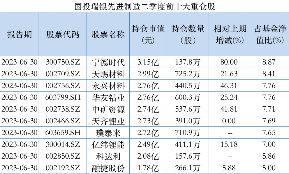 此外还不同程度增持了天赐材料、永兴材料、华友钴业、中矿资源、亿纬锂能,其中,永兴材料、中矿资源较上期增持46.31 %、41.81 %,截至二季度末,该基金分别持有永兴材料440.5万股、中矿资源537.6万股,持有市值分别达2.76亿元、2.74亿元。
