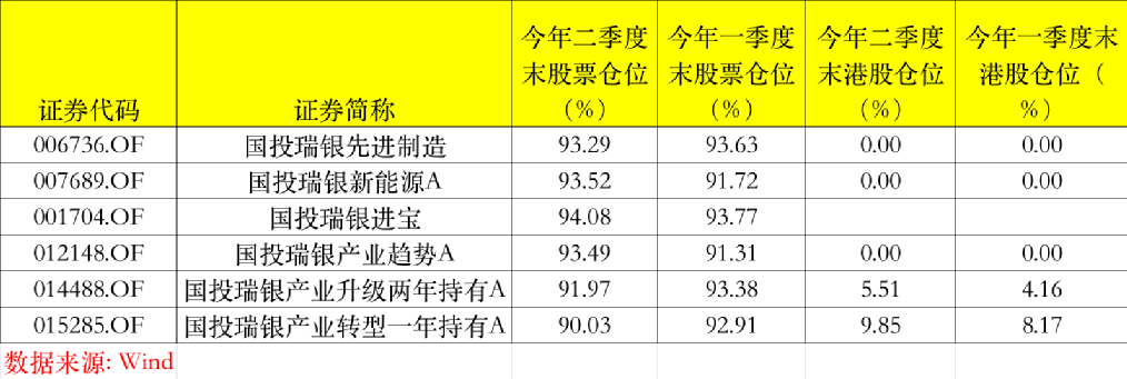 港股仓位也有不同程度提升,国投瑞银产业升级两年持有A、国投瑞银产业转型一年持有A的港股仓位从今年一季度末的4.16%、8.17%,提升至二季度末的5.51%、9.85%。