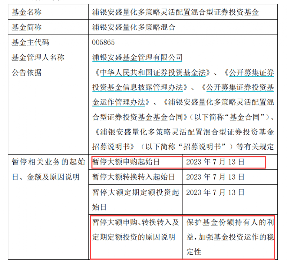 7月13日,浦银安盛基金发布公告称,旗下浦银安盛量化多策略灵活配置混合基金即日起暂停1000万元以上的大额圣申购,限购原因为保护基金份额持有人的利益,加强基金投资运作的稳定性。
