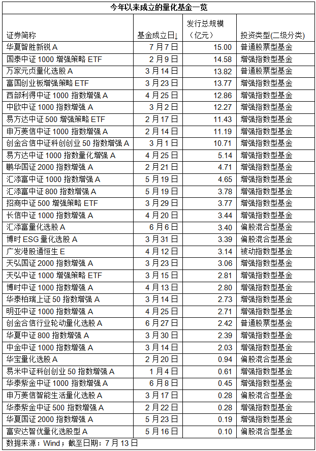 Wind数据显示,今年以来截至7月13日,已有33只量化基金成立,其中增强指数型基金居多。
