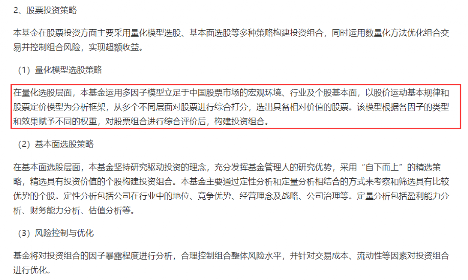 尽管名称中不带”量化“,该基金也是一只采取量化策略的主动权益产品。在股票投资方面主要采用量化模型选股、基本面选股等多种策略构建投资组合,同时运用数量化方法优化组合交易并控制组合风险,实现超额收益。