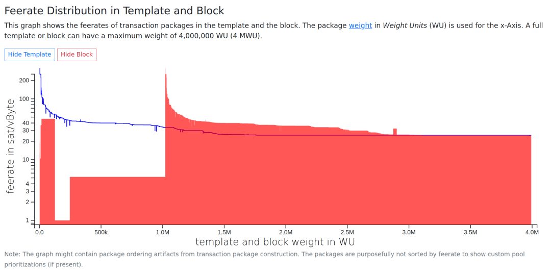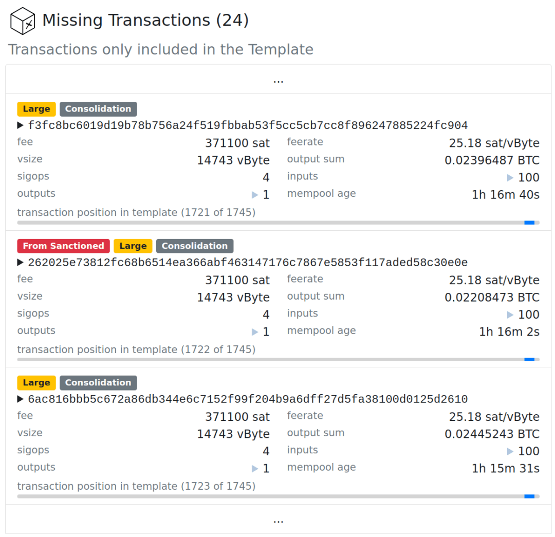 在 miningpool.observer 上检查 808660 区块的费率分布,发现 ViaBTC 占用了大约 4 MWU 中的 1 MWU 的块空间,其中包括优先处理的交易。这些交易可能来自 ViaBTC 比特币交易加速器。优先处理一些交易意味着较低费率的交易,例如从受制裁地址支出的交易,在该区块中无法包含。对于这个 ViaBTC 区块,我的 miningpool-observer 实例列出了 24 个未包含在该区块中的大型合并交易。
