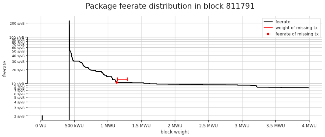 在区块 811791 中,包含了缺失交易的费率和权重的交易包的费率分布。