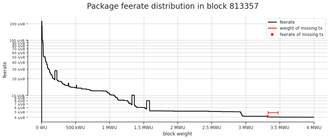 在区块 813357 中,包含了缺失交易的费率和权重的交易包的费率分布。