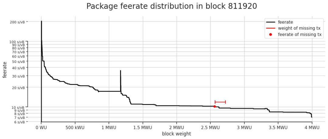 在区块 811920 中,包含了缺失交易的费率和权重的交易包的费率分布。