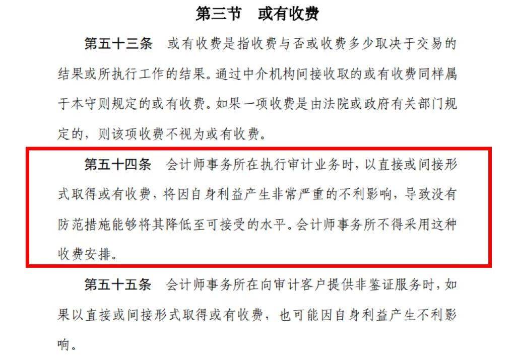 会计师事务所在提供审计服务时,以直接或间接形式取得或有收费,将因自身利益产生非常严重的不利影响,导致没有防范措施能够将其降低至可接受的水平。会计师事务所不得采用这种收费安排。“这个要求在会计准则里存在很多年了,其实或有收费一直都是违规的,这次就是老话重提。”他表示。