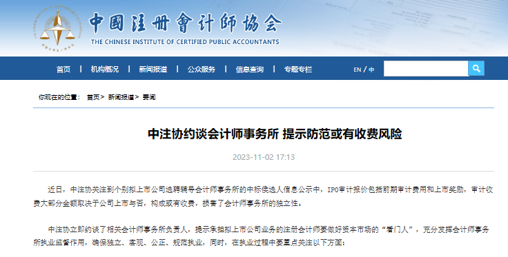 11月2日,中国注册会计师协会(以下简称“中注协”)发布公告提示防范或有收费风险并约谈了部分会计师事务所。公告显示,中注协关注到个别拟上市公司选聘辅导会计师事务所的中标候选人信息公示中,IPO审计报价包括前期审计费用和上市奖励,审计收费大部分金额取决于公司上市与否,构成或有收费,损害了会计师事务所的独立性。