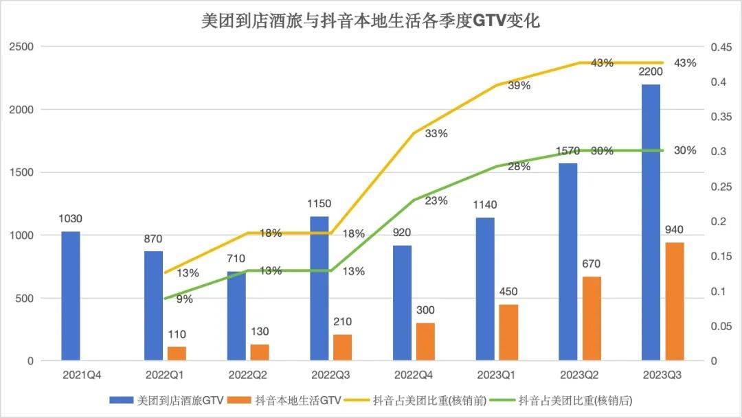 回看过去三个季度,抖音本地生活与美团到店酒旅的GTV其实一直在缩小。虽然二季度的环比增速略萎靡,但抖音本地生活在三季度重振旗鼓。36氪拿到的多份调研纪要显示,其Q3的GTV已经超过了900亿,四季度将大概率完成1000亿的GTV目标,从而在年内完成超3000亿的GTV,这将达到美团到店酒旅(核销前)40%的量。