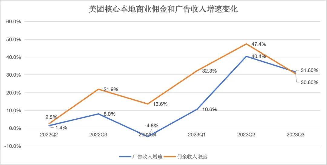 效果也相当明显。此前市场最大的担心是与抖音的竞争,会抢走了商家在美团的广告预算,在过去几个季度这一度成为了现实,今年Q1美团核心商业的佣金和广告收入的剪刀差一度达到22%,但到了本季度,这一增速差几乎被抹平,回过神的商家又开始往美团回移。