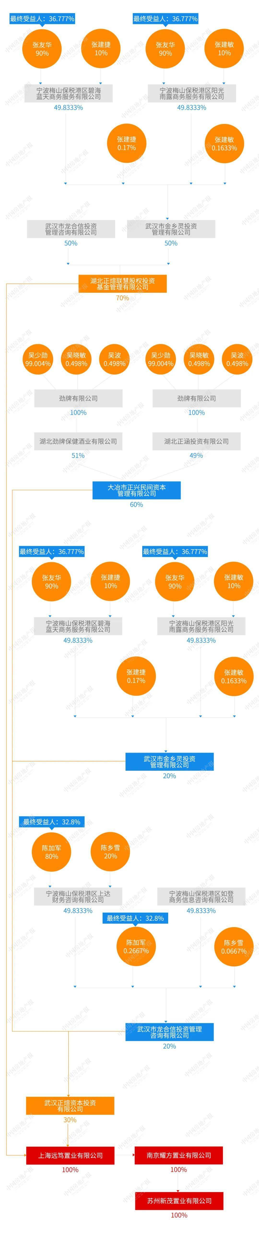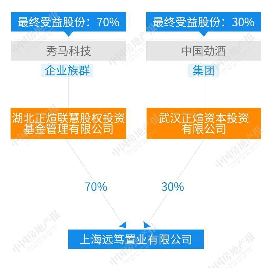 中国房地产报记者通过企查查APP股权穿透发现,南京耀方与中国金茂并无直接股权关联。今年1月刚成立的上海远笃置业持有南京耀方100%股份,上海远笃置业背后真正的“金主”分别为秀马科技企业族群(最终受益股份:70%)和中国劲酒集团(即劲牌有限公司,最终受益股份:30%)。秀马科技企业族群与劲牌有限公司(以下简称“劲牌”)中的多位股东和高管均有重叠和关联。