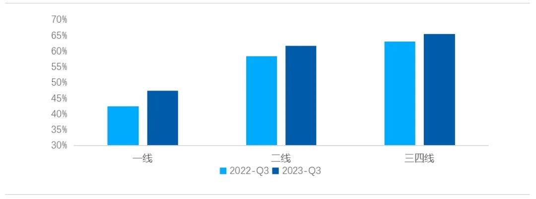 分能级统计,2023年三季度,一线城市平均贷款成数为47.5%,较去年同期提高5.0个百分点,较上季度提高3.0个百分点,提升幅度最大,主要是受8月底9月初 “认房不认贷”政策降低改善客群贷款购房门槛的影响;二线城市平均贷款成数为61.7%,较去年同期提高3.3个百分点;三四线城市平均贷款成数最高,为65.5%,较去年同期提高2.3个百分点。