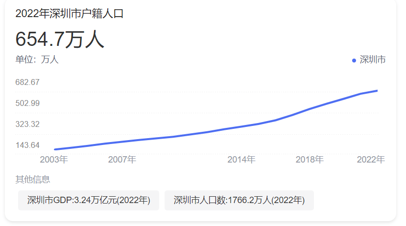 2023年5月8日,深圳市统计局、国家统计局深圳调查队曾公布《深圳市2022年国民经济和社会发展统计公报》,数据显示2022年深圳全市常住人口为1766.18万人,深圳户籍人口有654.7万人,也就是说非户籍人口占67%。