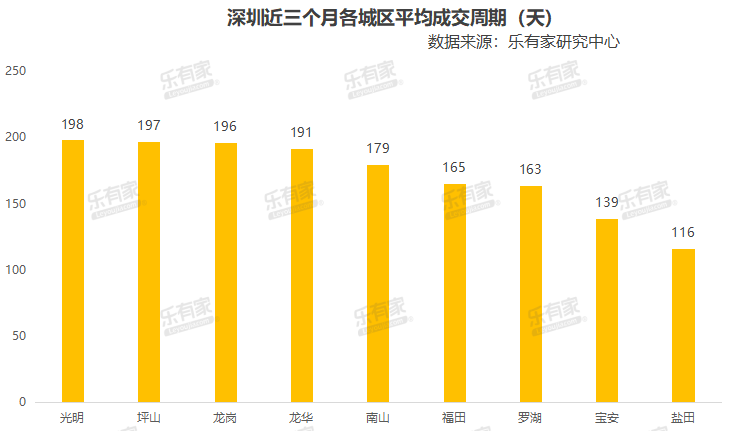 从乐有家监测的数据可知,近三个月(8-10月)市场进入政策观望期,成交周期拉长,光明、坪山、龙岗、龙华二手成交周期接近200天。即平均一套房子从挂牌到出售超过6个月的时间。