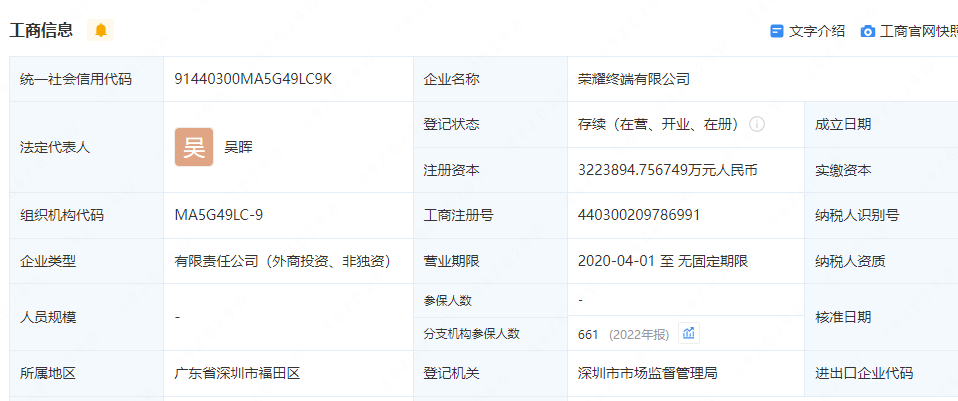 天眼查信息显示,荣耀终端有限公司成立于2020年4月,注册资本约322.39亿人民币,由深圳市鹏程新信息技术合伙企业(有限合伙)、深圳国资协同发展私募基金合伙企业(有限合伙)、京东方A(000725)等共同持股。