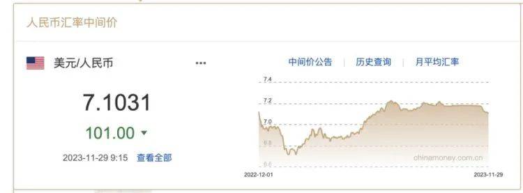 中国外汇交易中心的数据显示,11月29日,人民币对美元中间价报7.1031,上调101点,创6月5日以来的新高。