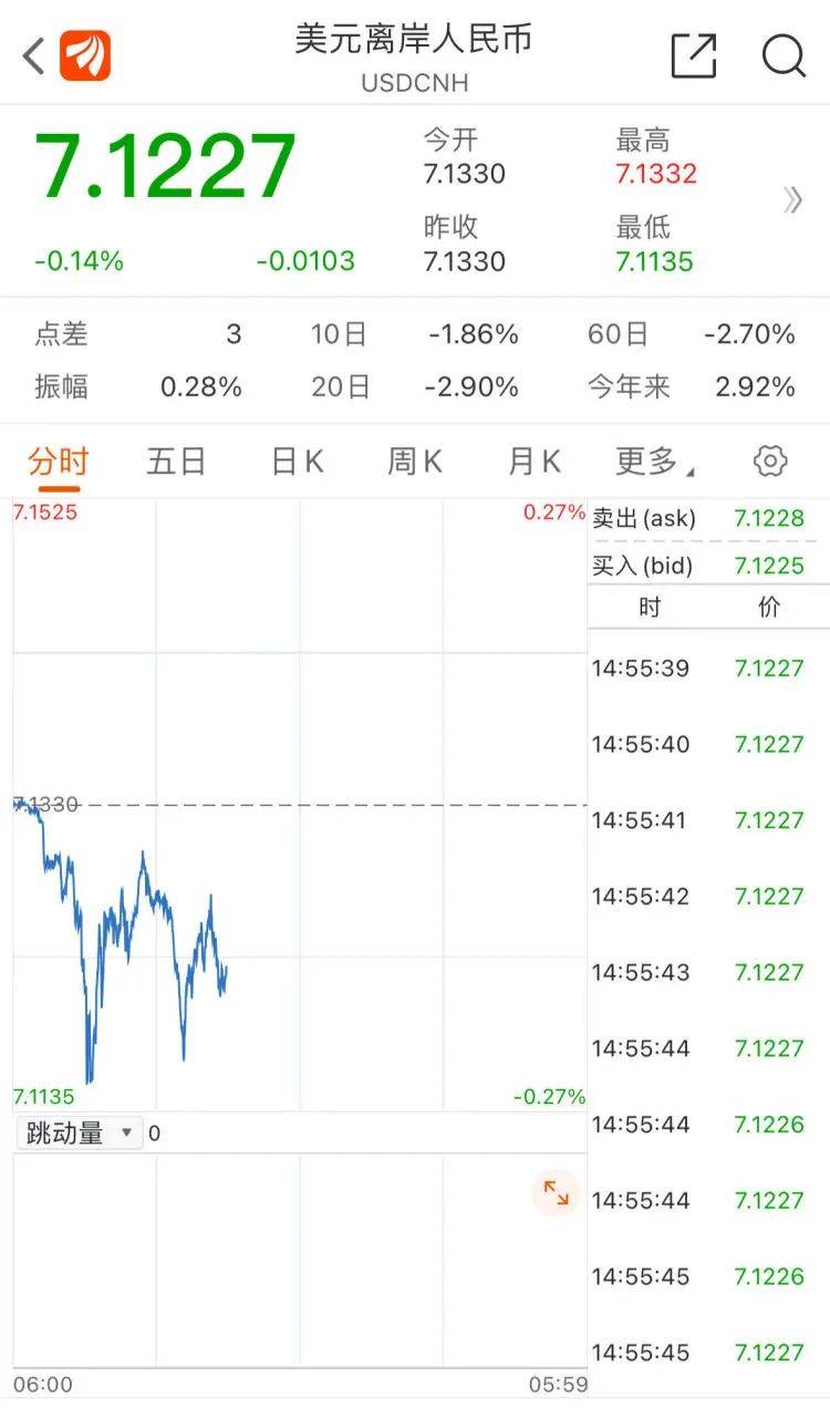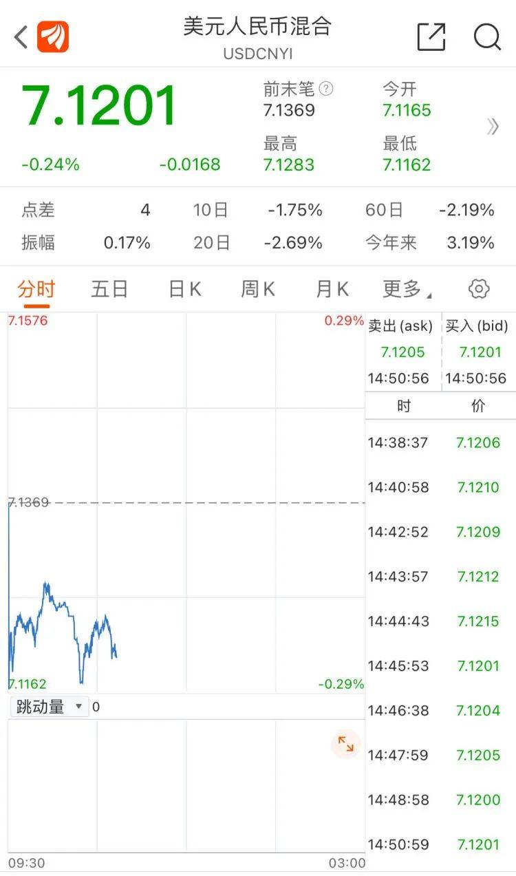 受美元指数走低影响,截至发稿,人民币对美元汇率在在岸和离岸市场双双升破7.12关口。