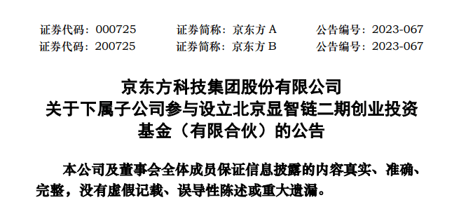 投资界消息,11月28日,京东方A(证券代码:000725)发布公告,公司全资子公司京东方创新投资有限公司拟出资9.9亿元参与设立北京显智链二期创业投资基金。