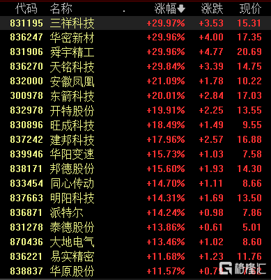 其中北交所相关个股更是飙涨,三祥科技、舜宇精工、天铭科技等30cm涨停,东箭科技、明阳科技等大幅跟涨。