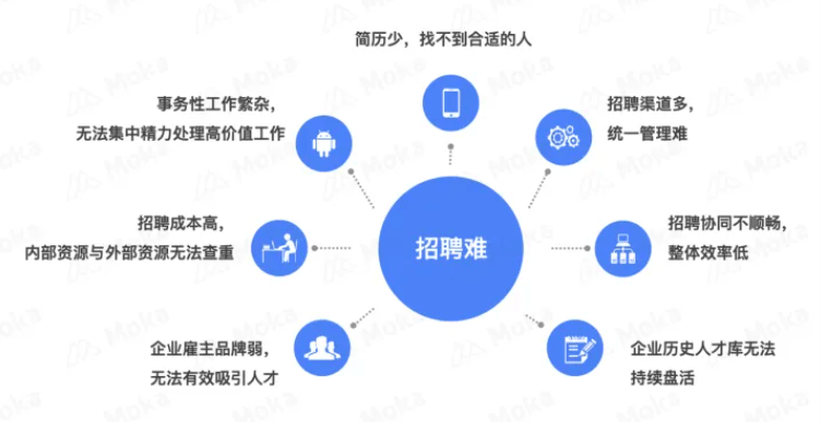 其次是招聘成本高这个难题。而招聘成本高正是因为整个招聘过程繁琐耗时导致,从最初的接收投递的简历,到简历筛选,再到笔试测评、面试,以及确定录用意向,以及最后的培训实习入职,共计有六个节点。