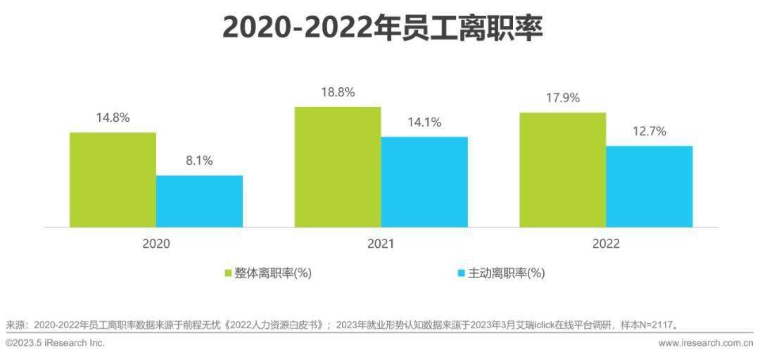同时,在外部环境不确定性增加的背景下,职场人更倾向于求稳,跳槽意愿明显减弱,因此企业寻求招聘服务的频率也出现下降。艾媒咨询研报显示,2022年员工主动离职率为12.7%,较2021年下降1.4%。