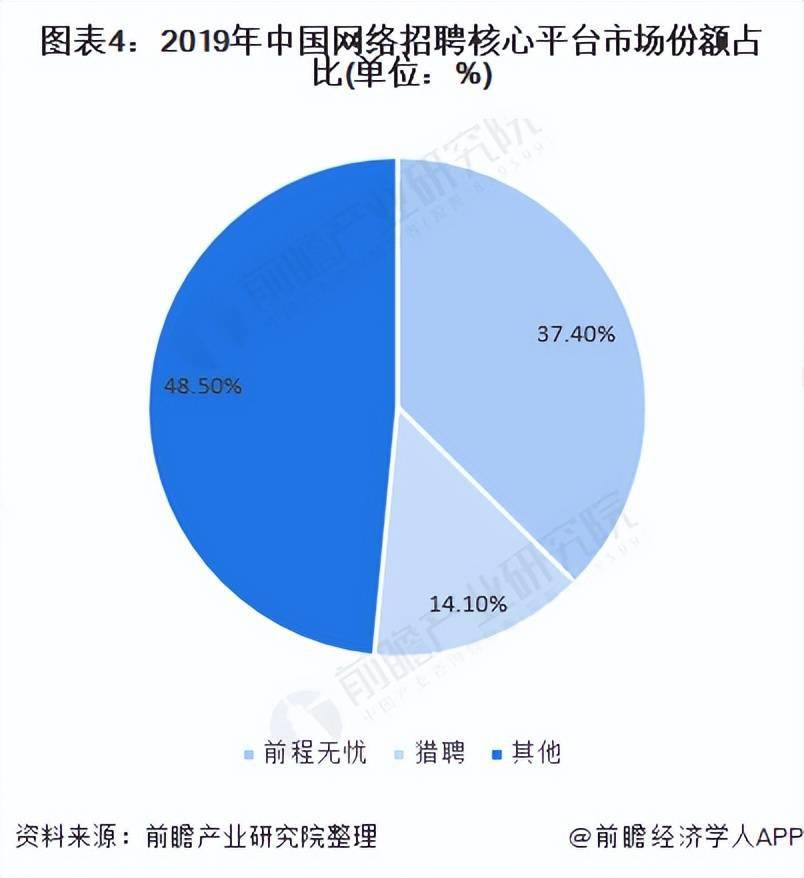 目前,网络招聘市场呈现高度集中的竞争格局。前瞻产业研究院报告显示,按营收来看,2019年前程无忧和猎聘网络招聘平台共占据超过50%的市场份额,其中猎聘占比排名第二,市场份额为14.1%。
