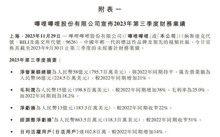 此外,第三季度,哔哩哔哩毛利润为人民币15亿元,较2022年同期增加38%。毛利率为25.0%,而2022年同期则为18.2%。报告期内,公司净亏损为人民币13亿元,较2022年同期收窄22%。经调整净亏损为人民币8.63亿元,较2022年同期收窄51%。