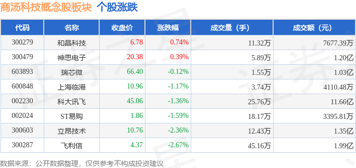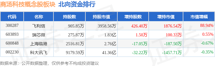 北向资金方面,当日商汤科技概念股板块北向资金持股市值为46.35亿元,增持331.66万元。其中增持最多的是飞利信,增持了0.19亿元。减持持最多的是科大讯飞,减持了0.15亿元。商汤科技概念股板块北向资金持股变动明细见下表: