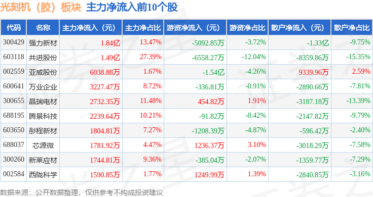 从资金流向上来看,当日光刻机(胶)板块主力资金净流入6368.56万元,游资资金净流出2.34亿元,散户资金净流入1.7亿元。光刻机(胶)板块个股资金流向见下表: