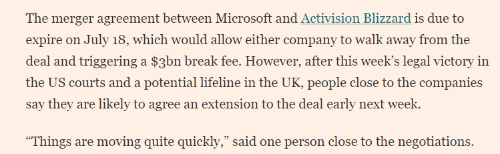 微软拟收购动视暴雪的交易需在7月18日的最终期限前完成,否则微软和动视暴雪需要重新谈判,或微软需向动视暴雪支付30亿美元解约赔偿金。据《金融时报》报道,微软和动视暴雪两家公司正就达成延长协议在努力谈判,以争取英国CMA对重组的批准。