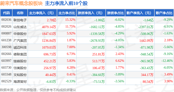 从资金流向上来看,当日蔚来汽车概念股板块主力资金净流出13.44亿元,游资资金净流入1.57亿元,散户资金净流入11.87亿元。蔚来汽车概念股板块个股资金流向见下表: