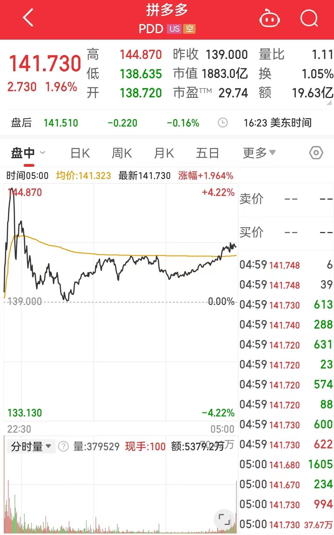 拼多多(PDD)报141.73美元,涨幅1.96%,市值1883亿美元。