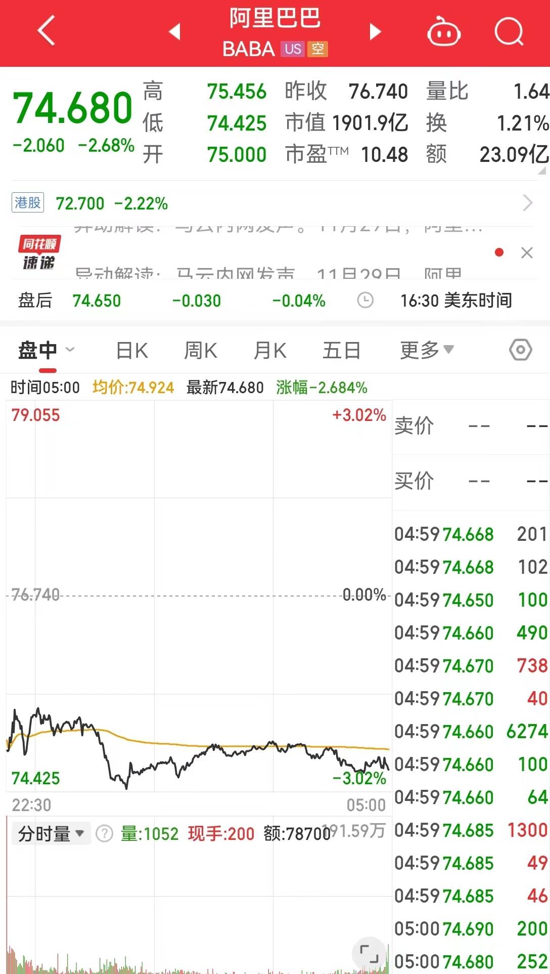 而老牌电商巨头阿里巴巴(BABA)报74.68美元,跌幅2.68%,市值1901.9亿美元。