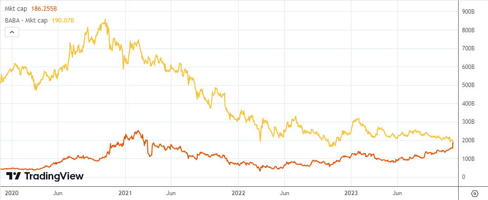 △橙色:拼多多美股市值 黄色:阿里巴巴美股市值。图源/财联社