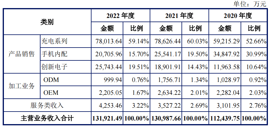 公司以充电系列、手机内配、创新电子三大系列为核心。报告期内,充电系列类产品销售收入占主营业务收入的比例为52.66%、60.03%和59.14%,手机内配系列类产品销售收入占主营业务收入的比例为30.99%、19.50%和15.70%,创新电子类产品销售收入占主营业务收入的比例为10.64%、14.43%和19.51%;上述三大类产品销售收入占公司主营业务收入比重分别为94.29%、93.96%、94.35%,系公司主营业务收入的主要来源。
