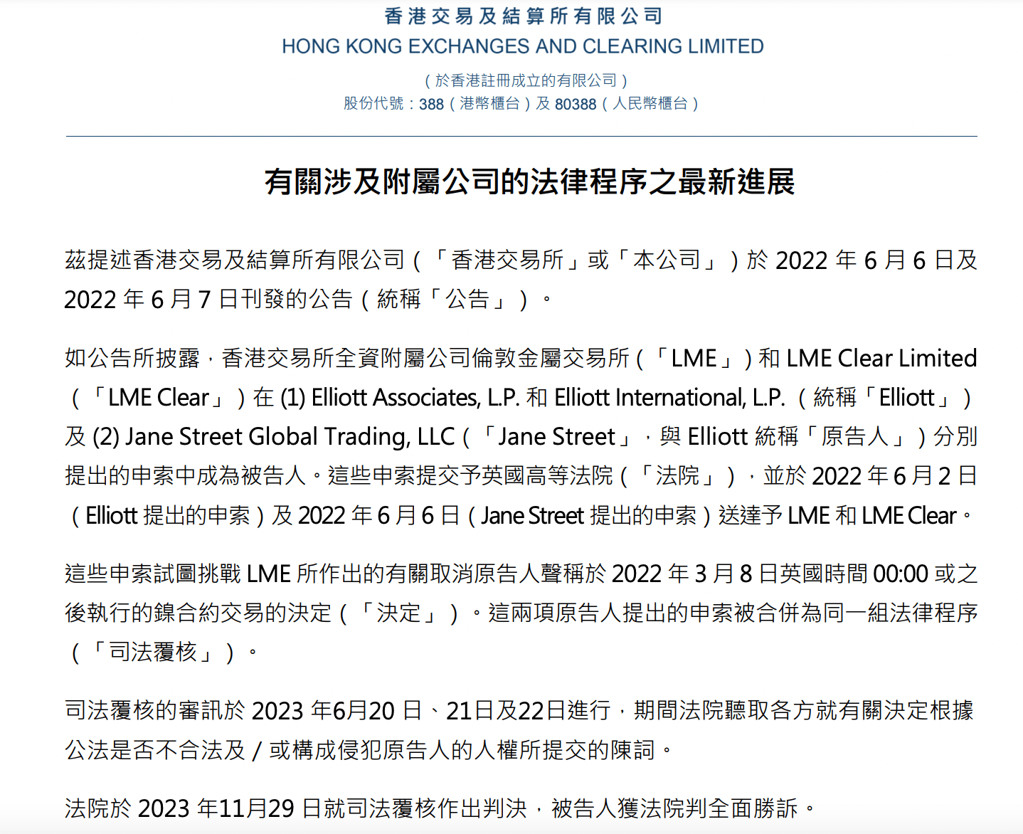 11月29日,香港交易所发布公告称,其全资附属公司LME 和LME Clear Limited在Elliott Associates, L.P. 和Elliott International, L.P.(统称“Elliott”)及Jane Street Global Trading, LLC(“Jane Street”)分别提出的申索中成为被告人。