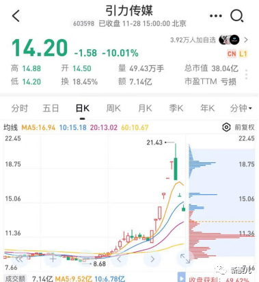 前几天,新腕儿写过一篇中文在线的文章,阐释过中文在线这些年在资本市场的心路历程。后台用户留言画风,和上述几位壮士的言论,有异曲同工之妙。下一家具有典型意义的公司是掌阅。相对于其他短剧概念股,掌阅的走势算不上经验,势头弱了很多,但这波跳水仍显得很合群。跳水同样发生在11月23日。掌阅当日下跌了8.01%,报收24.8元/股;就在前一天,掌阅股价上涨7.45%,报收27.6元/股,达到近半年内的峰值。帅不过三秒,在上周五的11月24日象征性的上涨1.01%后,掌阅股价同样在11月27日下跌9.98%,报收22.55元/股。次日上涨0.93%。跌10个点,涨1个点。还有一家短剧概念股引力传媒。这家公司的股价努力了几天后,快速躺平。在11月15日,引力传媒报收11元/股,后来的6天,连续6个涨停板后迅速跌停。也就是说,从11元到19.48元,用了6天时间。但从19.48,跌到14.2元,却只用了3天。引力传媒堪称二级市场头部过山车生产制造厂之一。