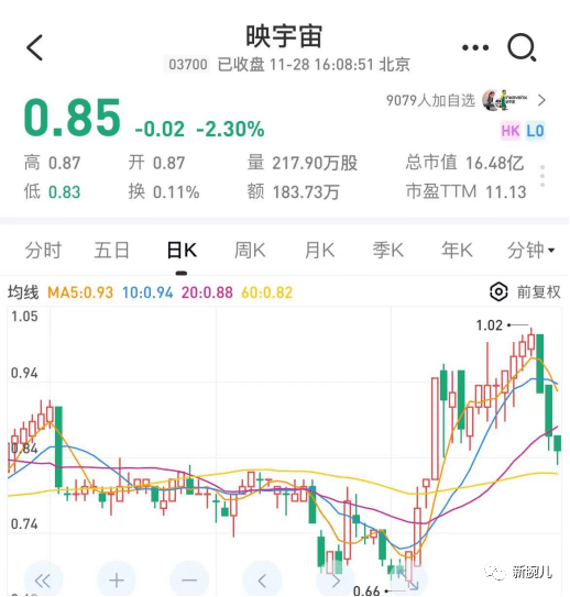 映宇宙也走出同样的步伐。11月23日,映宇宙股价经历几日上涨,维持在1.02元。好不容易冲到1块钱,又跌回去了。11月24日、27日,到28日,连续三天,映宇宙跌去近15%以上,股价只剩下8毛。