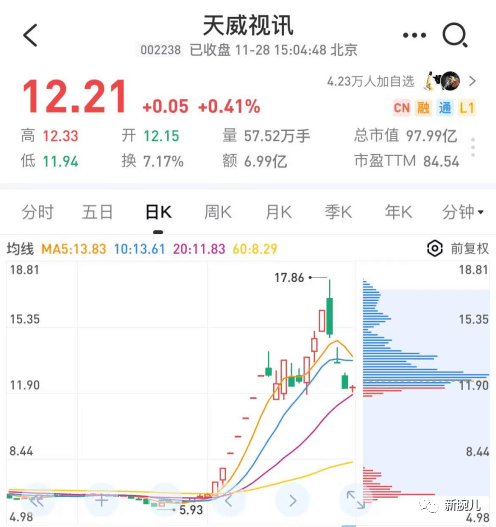 还有天威视讯,这是一家在短剧界很受关注的公司。不同于掌阅、阅文等,所做的业务与短剧直接相关。但天威视讯不同,他们是间接参与短剧行业。新腕儿在《河马短剧惊起一滩鸥鹭:天威蹊跷七连板,点众妙棋占先机》 一文中提到过,天威视讯持有中广电传媒26.17%的股份,而中广电旗下的短剧APP为河马剧场,即为点众所运营的那家短剧平台。如此关系中,天威视讯则被寄予短剧希望。这次跳水潮中,天威视讯也未能免俗。据雪球数据显示,11月23日,天威视讯下跌7.57%,报收15.01元/股;11月24日,继续跌停,报收13.51元/股;周末结束后的11月27日,一如既往的一字跌停。接连三个跌停板,短剧界小太阳天威视讯在11月28日报收12.21元/股,微微上涨0.41%。