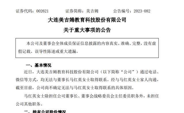 2023年11月29日晚,美吉姆、*ST天山两家上市公司发布公告称,董事长失联。美吉姆表示,通过电话、微信等方式,均无法与董事长马红英女士取得联系;而*ST天山公告内容与美吉姆基本一致,只不过主角换成了自家董事长马长水。