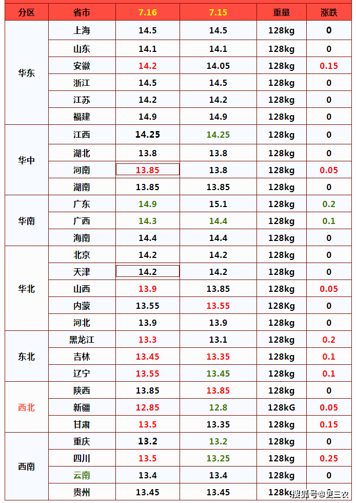从全国分区市场来看,7月16日,南北市场,猪价以偏稳为主,上涨现象略有增加,集中在北方省区,南方地区多以僵持为主,市场走势弱稳,情绪仍是支撑猪价上涨的关键!