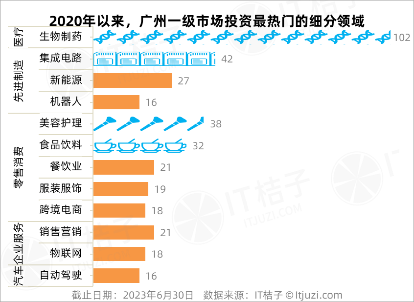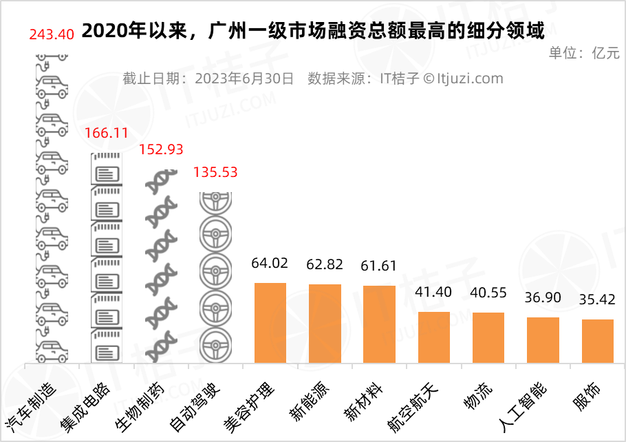 IT桔子数据显示,2020-2023上半年,广州市汽车制造、集成电路、生物制药、自动驾驶四个高科技赛道的融资总额均超过了百亿元,分别达到了243.4亿元、166.11亿元、152.93亿元、135.53亿元。