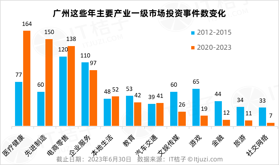 对比来看,2012-2015年,广州的一级市场投资事件仍以电商零售和企业服务两大行业为最高,其次是医疗健康、文娱传媒和游戏行业的融资,说明广州这几大产业在过去就有明显的基础积累优势。而2020-2023最近的这段时间,医疗和先进制造两大产业的融资热度超越了其他行业。